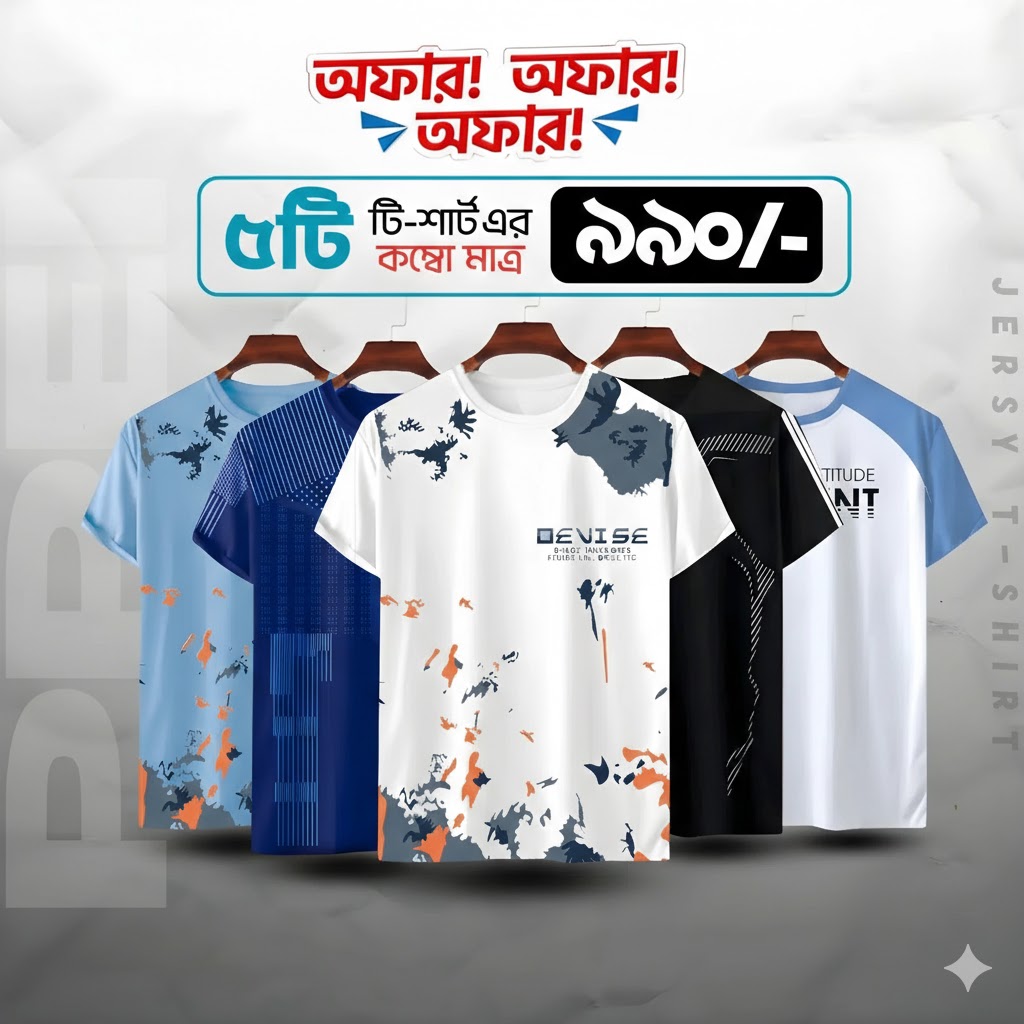 💥 *5 পিসের কম্বো প্যাক* নিতে আর দেরি না করে, আপনার গ্রীষ্মের জন্য আদর্শ টি-শার্ট সংগ্রহ করুন এবং আপনার প্রতিদিনের স্টাইলকে আরও স্মার্ট এবং আরামদায়ক করে তুলুন!
